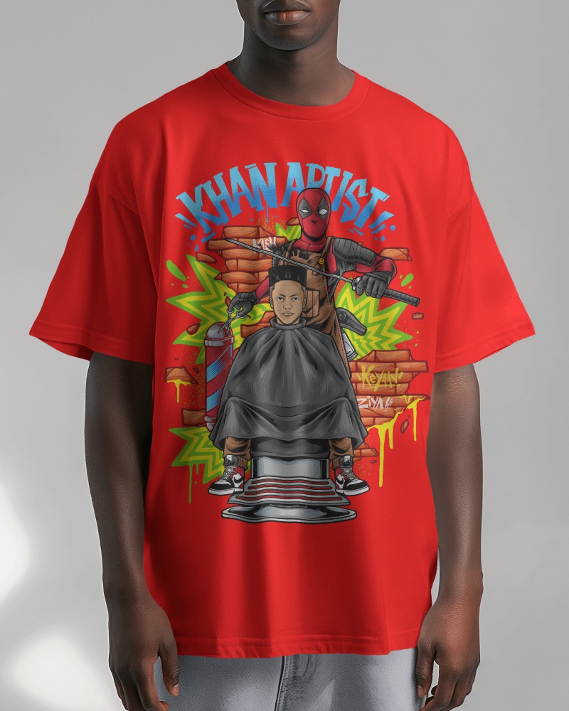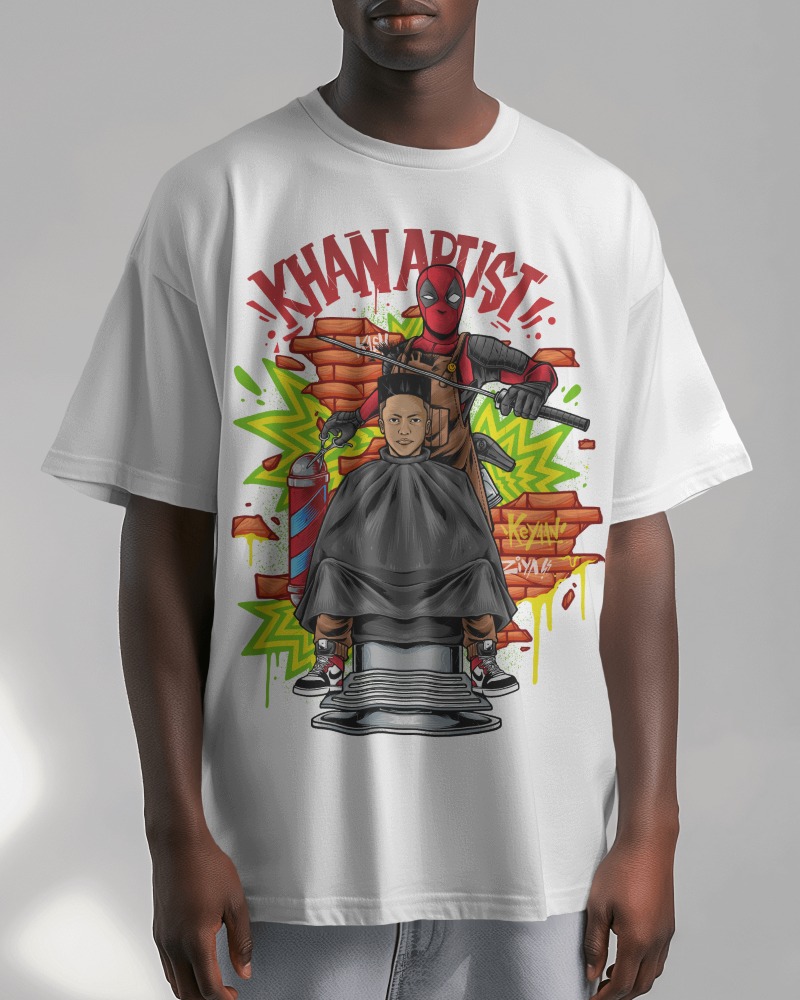Elevate your streetwear game with our "Anime Fusion" Graphic Tee! This vibrant t-shirt features an electrifying design that blends popular anime characters in an unexpected setting. The graphic showcases two iconic figures, reminiscent of Dragon Ball characters, engaging in a barber scene with one character styling the other's hair. Adding a playful touch, Pikachu joins the scene, holding a pair of clippers. The bold "Khan Artist" text runs vertically along the side in graffiti-style lettering. Made from high-quality, breathable fabric, this tee ensures both comfort and style. Perfect for anime enthusiasts and fans of unique, creative apparel, this shirt is available in various sizes. Stand out and express your love for anime culture with this distinctive piece.